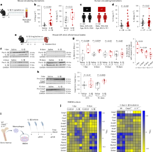a, graphical scheme of experiments. Csf1rCre IL-1rfl/fl mice were treated for 15 days with saline or IL-1β subcutaneously (SC). b, Western blot of IL-1β/pro-IL-1β in Csf1rCre IL-1rfl/fl mice. Quantitation levels were normalized to glyceraldehyde 3-phosphate dehydrogenase (GAPDH) loading control. Each sample represents one mouse heart; 5 saline-injected and 6 IL-1β-injected samples were analyzed. All the central lines in the box plots represent the median, the box limits represent the first and third quartiles and the whiskers denote the minimum and maximum values. P values were calculated with Student’s t-test.