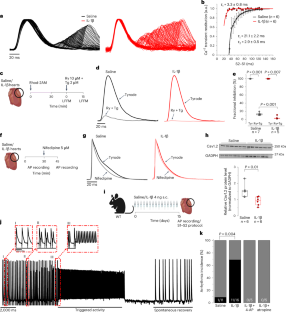a, Western blot of Calcium-Calmodulin Kinase II δ (CaMKII), phospho-CaMKII Thr287 (p-CaMKII) and oxidized-CaMKII Met 281/282 (oxi-CAMKII). Quantitation levels were normalized to vinculin, used as loading control. Each sample represents one mouse heart; 5 saline-injected and 3 IL-1β-injected samples were analyzed. b Western blot of catalytic subunit of Protein kinase A (PKA). Quantitation levels were normalized to glyceraldehyde 3-phosphate dehydrogenase (GAPDH) loading control. Each sample represents one mouse heart; 8 saline-injected and 8 IL-1β-injected samples were analyzed (see the second membrane in uncropped Material). c, APDs before and after Nifedipine perfusion (at 30%, 50%, 70%, and 90% of repolarization). Data are presented as individual values before and after condition. Data in a and b are presented as the central lines in the box plots represent the median, the box limits represent the first and third quartiles and the whiskers denote the minimum and maximum values. Data in c is presented as individual values before and after condition. P values were calculated with unpaired Student’s t-test (two-tailed) (a,b), and paired samples Student’s t-test (two-tailed) (c).