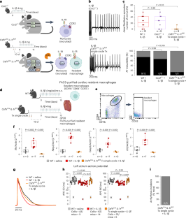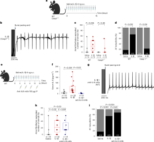 a, graphical scheme of experiments. Casp1-/- mice were treated for 15 days with saline or IL-1β subcutaneously (SC). b, representative EKG traces from saline and IL-1β treated mice. c, EKG parameter analyzed: RR interval, p wave duration, and PR interval. d, representative action potential traces from saline and IL-1β treated Casp1-/- mice. e, action potential duration (APD) at 30%, 50%, 70% and 90% of repolarization, from saline and IL-1β treated mice. Lower inset panel show adjusted mean ± 95% C.I.f, triggered activities in Casp1-/- mice. g, graphical scheme of IL-6 restitution in Casp1-/- mice injected with IL-1β. h, representative EKG trace in sinus rhythm after burst-pacing in Casp1-/- mice injected with IL-1β and IL-6. i, AF inducibility after burst-pacing in Casp1-/- mice injected with IL-1β and IL-6. All the central lines in the box plots represent the median, the box limits represent the first and third quartiles and the whiskers denote the minimum and maximum values. Categorical data are presented as bar plots (f,i). P values were calculated with Student’s t-test (two-tailed) (c), hierarchical analysis with mixed effect model (e), and Fisher’s exact test (f,i) (two-tailed).