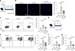 a, In mice receiving neutralizing α-IL12b with concurrent α-CD40 agonist treatment antibodies for 7 days, IFN-γ+CD44+ CD8 T-cells were quantified in the heart by flow cytometry with comparison between α-CD40 (n = 5), and α-CD40+α-IL12b (n = 5). b, In mice receiving neutralizing α-TNF with concurrent α-CD40 agonist treatment antibodies for 7 days, IFN-γ+CD44+ CD8 T-cells were quantified in the heart by flow cytometry with comparison between α-CD40 (n = 4), and α-CD40+α-TNF (n = 4). c, In mice receiving depleting α-CD8 with concurrent α-CD40 agonist treatment antibodies for 7 days, CD8+ T-cells were quantified in the spleen by flow cytometry to confirm CD8 T-cell depletion when comparing α-CD40 (n = 6) and α-CD40+α-CD8 (n = 6). d, In mice receiving depleting single agent α-CD4 or combined α-CD4 with α-CD8 and concurrent α-CD40 agonist for 7 days, CCR2+ macrophages were quantified in the heart by flow cytometry with comparison between Rat IgG (n = 3), α-CD40 (n = 6), α-CD40+α-CD4 (n = 6), and α-CD40+α-CD4+α-CD8 (n = 6). One-way ANOVA with Sidak correction. Two-tailed unpaired Student’s t-test performed for all statistical analysis except as noted. Error bars indicate means ± s.e.m.