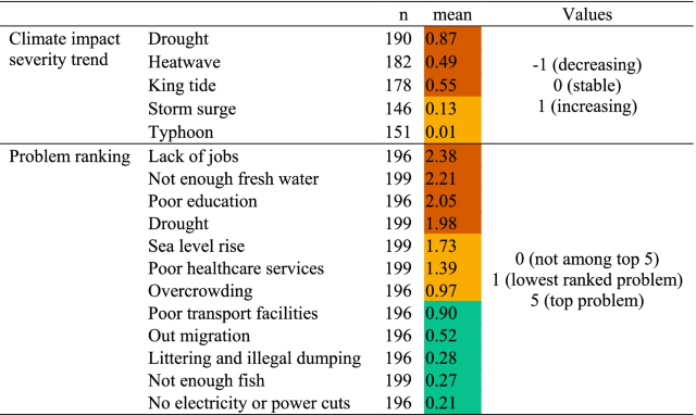 Table 2 Perceptions of climate impact severity trends and rankings of problems facing the household. Green shading indicates decreasing severity/lower problem rankings; orange indicates stable severity/medium problem rankings; red indicates increasing severity/highest problem rankings