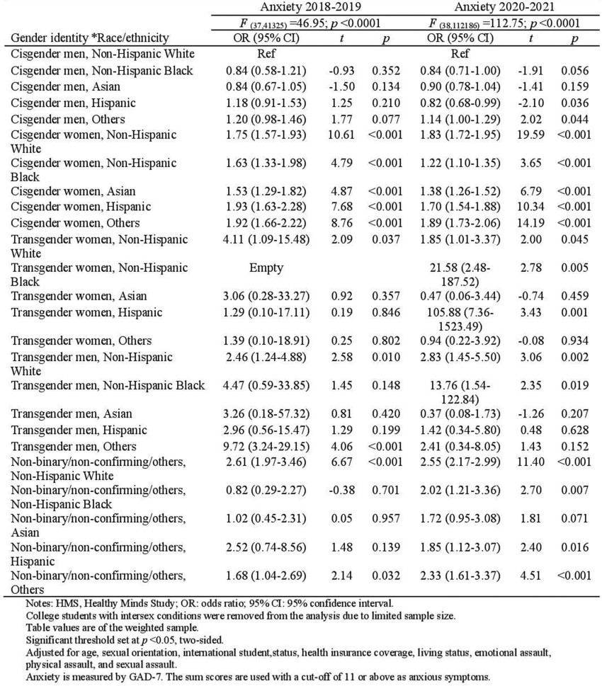 Extended Data Table 5 Weighted multivariable logistic regressions of anxiety with interaction term between gender identity and race/ethnicity, HMS 2018-2019 and 2020-2021