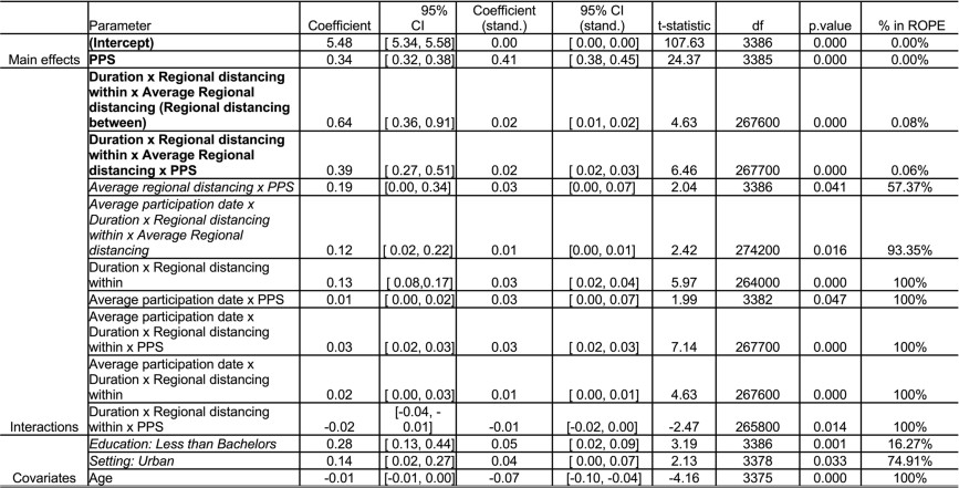 1. This table reports results of linear mixed models predicting loneliness as a function of Regional Distancing (based on regional cell phone mobility data51 within US participants; higher values = less mobility / more distancing), Time, and Patient Probability Score (PPS), while controlling for demographic categories in 3415 participants with sufficient data. We use the same reporting conventions as Table 2 and Extended Data Tables 14: Practically significant factors are bolded, statistically significant factors of undecided practical significance are italicized, and effects that were consistent with the null hypothesis are reported in plain text. Complete results including non-significant factors (p > 0.05) are reported in Supplementary Table 25. Results were evaluated using the following model: loneliness ~ Gender + Education + Ethnicity + Racial identity + Setting + Age + Time between*Time within* Regional distancing within* Regional distancing between*PPS + (1 + Time within + Regional distancing within| SUBJECT_NUMBER).