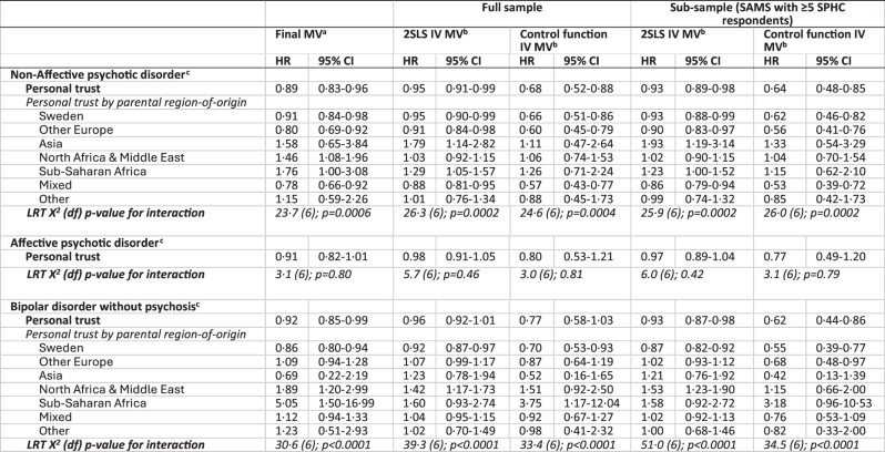 Extended Data Table 6 Sensitivity analyses of instrumental variable analyses using SAMS-level 2002 voter turnout at county council elections as an IV for personal trust in multilevel Cox proportional survival models