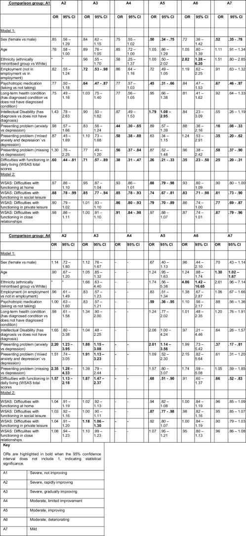 Extended Data Table 2 Regression model including risk factors for anxiety trajectories; odds ratios (OR) are reported with 95 % confidence intervals (95% CI)