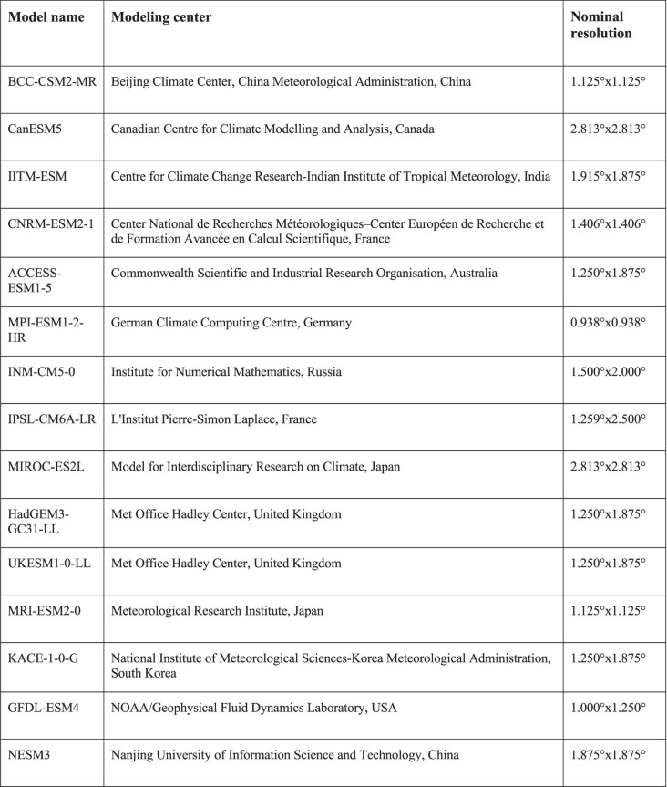 Extended Data Table 1 List of 15 climate models participating in the Coupled Model Inter‐comparison Project phase 6 (CMIP6) that were used for projections of future temperatures
