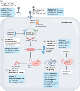Delivery of CRISPR–Cas therapeutics requires engineering to enhance efficiency, adapt the host range to the target strains and bypass bacterial defence mechanisms.