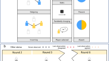 Following previous studies, we model problem solving by simulating agents searching for the global maximum on a rugged landscape13,14,17,18,19. As shown in Fig. 1, solutions are represented as points on a surface embedded in three-dimensional space, with their height representing their payoff. (In the Supplementary Information (SI) we show that our results also hold when we replace this two-dimensional surface with a multidimensional NK-landscape20.) Each agent occupies a point on the landscape corresponding to that agent’s current solution. Agents are only aware of the payoffs of solutions in the local neighborhood of their current solution and attempt to find the highest peak, or global optimum, by “hill climbing,” that is, repeatedly moving to the highest payoff solution that they can “see”21. As an agent improves upon its current solution, new possibilities come into view. The presence of many local optima complicates the search for the globally optimal solution because hill-climbing agents may become stuck at the top of these local peaks with no further improvements in sight.