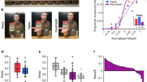 Subsequent work has generalized and refined the conditions under which this result holds16,17,18,19 and shown that the predicted linear relationship between bias and the gradient of squared discrimination threshold, \(b(x)\propto {(D{(x)}^{2})}^{{\prime} }\), is replicated across a wide range of stimulus variables15. However, while the theoretical model has been extended to multidimensional stimuli20,21, empirical examples of these phenomena have so far been limited to single sensory variables. In this study, we analyzed a set of properties whose occurrence is correlated in the natural environment: the size, weight, and surface material of liftable objects.