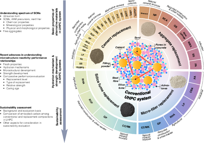 An overview of the limitations associated with the original constituents of UHPC is presented in Fig. 1b. In summary, the sustainability limitations of conventional UHPC from a material perspective can be broadly categorised into three key challenges: (i) high cement and silica fume content with limited hydration efficiency, (ii) extensive reliance on non-renewable natural resources such as silica sand and ground quartz; and (iii) increased environmental impact from the production of steel fibres. Since 2000s, the development trajectory of UHPC has gradually shifted from the pursuit of ever-higher performance toward addressing these pressing environmental and economic concerns30, with the aim of reducing both its embodied CO2 emissions and high initial material costs of UHPC. To this end, current research efforts have converged to three main sustainability-driven strategies: (i) reducing cement and silica fume content by incorporating high volumes of supplementary cementitious materials (SCMs); (ii) substituting natural fine aggregates with recycled or alternative aggregate sources, and (iii) lowering steel fibre usage through the adoption of waste-derived or hybrid reinforcement systems. Among these approaches, the reduction of cement content has received the most significant focus within the research community, largely driven by the urgent global need to curb greenhouse gas emissions from cement manufacturing. This prioritisation is well justified: cement production alone contributes ~7–8% of global CO2 emissions31,32, primarily due to the calcination of limestone and the combustion of fossil fuels during kiln operation. Moreover, as aformentioned, the large proportion of unhydrated cement functions merely as inert, high-cost filler, highlighting a critical inefficiency from both economic and environmental standpoints. As such, reducing the cement in UHPC not only mitigates carbon emissions but can also improve binder efficiency, provided that the designed mix is properly engineered to maintain—or even enhance—the performance of the composite.