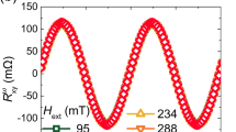 First, we check the conventional behaviors of \({R}_{{xy}}^{1\omega }\) and \({R}_{{xy}}^{2\omega }\) in a Pt (3 nm)/YIG (30 nm) layer in a low-current regime (\({J}_{0}\, < \,1\times {10}^{11}{\rm{A}}/{{\rm{m}}}^{2}\)). Here, YIG film was grown on a GGG (111) substrate by means of RF sputtering at room temperature, followed by a post-annealing step at 750 °C in an oxygen environment for two hours. Details of the sample growth conditions are provided in the Methods section. The grown YIG film exhibits good crystallinity well matched to the GGG substrate (Supplementary Note 3) and in-plane magnetic anisotropy (Supplementary Note 4). Figure 1b shows an image of the Hall bar device. Figure 1c, d show the \({R}_{{xy}}^{1\omega }\) and \({R}_{{xy}}^{2\omega }\) of the sample measured at a current density of \(8.3\times {10}^{10}{\rm{A}}/{{\rm{m}}}^{2}\) with different magnetic fields (\({H}_{{\rm{a}}}\)). Note that even in a Pt/YIG film with an insulating FM, where the current flows only in the non-magnetic Pt, \({R}_{{xy}}^{1\omega }\) depends on the magnetization direction of YIG due to the spin Hall magnetoresistance27,35, the magnetic proximity effect in Pt36,37,38, and interfacial spin-dependent scattering39. Note that the angular dependence of the longitudinal resistances of the sample was also measured, corresponding to spin Hall magnetoresistance (unidirectional spin Hall magnetoresistance) with a magnitude of 0.036% (\(2.3\times {10}^{-4} \%\)) at \({J}_{0}=1\times {10}^{11}{\rm{A}}/{{\rm{m}}}^{2}\) and \({H}_{{\rm{a}}}=25\) Oe for the first (second) harmonic resistance (Supplementary Note 5). Figure 1c shows the angular dependence of \({R}_{{xy}}^{1\omega }\), identical in all cases regardless of the magnitude of \({H}_{{\rm{a}}}\) and thus exhibiting typical sin 2ϕ behavior of PHE. This indicates that the magnetization of the YIG coherently rotates following the \({H}_{{\rm{a}}}\). On the other hand, Fig. 1d shows the angular dependence of \({R}_{{xy}}^{2\omega }\), demonstrating clear dependence on \({H}_{{\rm{a}}}\). This is expected from Eq. (4), indicating that the \({H}_{{\rm{a}}}\) contribution to \({R}_{{xy}}^{2\omega }\) overtakes that of the SOT-induced effective fields (\({H}_{{\rm{DL}}}\), \({H}_{{\rm{FL}}}\)) for a large \({H}_{{\rm{a}}}\). To obtain \({H}_{{\rm{DL}}}\) and \({H}_{{\rm{FL}}}\), we separated the cos ϕ and \(\left[2{\cos }^{3}\phi -\cos \phi \right]\) components and then plotted the extracted \({R}_{\cos \phi }^{2\omega }\) and \({R}_{\left[2{\cos }^{3}\phi -\cos \phi \right]}^{2\omega }\) values as a function of \(1/{H}_{{\rm{eff}}}\) and \(1/{H}_{{\rm{a}}}\), respectively (Fig. 1e, f). From the slopes of the \({R}_{\cos \phi }^{2\omega }\) and \({R}_{\left[2{\cos }^{3}\phi -\cos \phi \right]}^{2\omega }\) versus \(1/{H}_{{\rm{eff}}}\) and \(1/{H}_{{\rm{a}}}\) curves, the values of \(\left({H}_{{\rm{FL}}}+{H}_{{\rm{Oe}}}\right)=0.93\) Oe, \({H}_{{\rm{DL}}}=10.1\) Oe were extracted at \({J}_{0}=1\times {10}^{11}{\rm{A}}/{{\rm{m}}}^{2}\). Note that we obtained a value of \({R}_{{\rm{AHE}}}=2.7{\rm{m}}\Omega\) (Supplementary Note 6) and the y-intercept of the \({R}_{\cos \phi }^{2\omega }\) vs \(1/{H}_{{\rm{eff}}}\) plot (Fig. 1e) indicates the SSE component (\({R}_{{xy}}^{{\rm{SSE}}}\)). These behaviors are consistent with those in the previous reports30.