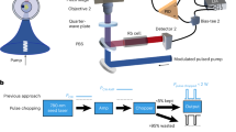Within this measurement series, we also encoded two amplitude levels on two consecutive short pulses to demonstrate the reliable retrieval of the respective levels and the maintenance of the bandwidth (Fig. 3b). Note that the storage of such short pulses is enabled by the large Brillouin gain in this type of chalcogenide waveguide, together with the high peak power of the control pulses. The criterion for efficient Brillouin storage is that the control pulse area be sufficiently large; the pulse area20,26 is \(\Theta =\sqrt{\pi c{g}_{0}{P}_{{{{\rm{c}}}}}/16\ln 2\,n{\tau }_{{{{\rm{ph}}}}}}{\tau }_{{{{\rm{c}}}}}\) where g0 ~ 500 m−1 W−1 is the Brillouin gain, Pc ~ 20 W is the peak power of the control pulse with pulse duration (FWHM) τc ~ 400 ps, n ~ 2.37 is the optical mode index and τph ~ 10 ns is the phonon lifetime. With these values the pulse area is approximately Θ ~ 2.4, which is not far from the optimum at Θ = π/2, and yet not so strong that the “write” process begins to reverse, which occurs for Θ > π/2. (This behavior is of course strongly analogous to the physics of the well-known optical Bloch equations27).