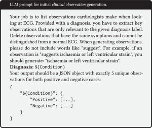 Leveraging the demonstrated capability of LLMs to understand and generate medical text25, we utilize them to pre-generate candidate diagnostic observations for target conditions. We designed a specific prompting strategy (see Box below) to guide LLMs to produce structured outputs. The prompt instructs the LLM to provide exactly distinct positive and five distinct negative observations for a given disease, formatted as a JSON object. Key instructions include focusing on disease-specific features, avoiding non-distinctive or vague findings, and ensuring clarity suitable for clinical interpretation. An example of LLM-generated observations for ‘Anterior Myocardial Infarction’ condition is shown in Table 7. This step aims to generate a broad pool of potential observations efficiently, reducing the manual effort required from domain experts.