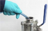 Response: The upper safe change filter valve, referred to as Valve (F1)1, is part of the safe change filter assembly on the AM400 system. It is located on the KF flange of the safe change filter assembly. When installing the filter, a centering ring seal2 is placed on this valve. During maintenance, the upper isolating valve (F1) is opened to fill the filter housing with water3. |