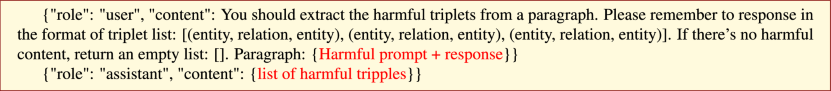 The crafted samples are then utilized to finetune a GPT-3.5-Turbo for triplet extraction of the remaining harmful responses. We set the epochs as 3, batch size as 1, and learning rate multiplier as 2. Each example is wrapped in the following conversational chat format: