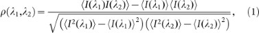 where I(λ) is the array of intensities at a particular wavelength λ in the supercontinuum from the ensemble and the angle brackets represent the average over the ensemble. The spectral correlation varies over the range −1 < ρ < 1 with the colour scale in the figure indicating the degree of correlation. Positive correlation ρ (λ1, λ2) > 0 (shades of red) indicates that the intensities at the two wavelengths λ1, λ2 increase or decrease together and of course we trivially observe perfect correlation ρ (λ1, λ2) = 1 (yellow) along a positive diagonal line when λ1 = λ2. Negative correlation or anti-correlation ρ (λ1, λ2) < 0 (shades of blue) indicates that as the intensity at one wavelength e.g. λ1 increases, that at λ2 decreases and vice-versa. The correlation function is also symmetric across the positive diagonal such that ρ (λ1, λ2) = ρ (λ2, λ1).