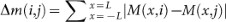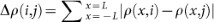 Color code plots indicating the dependence of Δm(i,j) (panels (a) and (b)) and Δρ(i,j) (panels (c) and (d)) with respect to two instants of time.