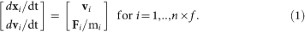 A Diatoma chain is modelled as an array of particles with mass, connected by three spring types, which build rigid cells, keep angles between cells and ensure the zigzag conformation of the chain (Figure 2b). Chain movement is determined by the motion of each individual particle of that particular chain. The particle movement is governed by the resultant of all the forces acting on it, according to Newton's laws. Each particle i is characterised by position xi = [xi,yi,zi] and velocity vi = [vxi,vyi,vzi] vectors, which concatenated form a phase space and the mass mi. The first particle of a Diatoma chain is irreversibly attached to the substratum and the other n particles can move. For the whole set of f chains, equations of motion can be written in a compact vector form as the system
