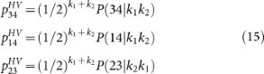 Note that here P(ij|kmkn) is just P(ij|li = km, lj = kn) when l1 = k1 as defined by our Definition 2 in previous section. For example, P(23|k2k1) is actually P(23|l2 = k2, l3 = k1). Similarly, if the beam-splitter's input state is |k1〉V|k2〉H, i.e. k1 vertical photons in mode a and k2 horizontal photons in mode b, we have