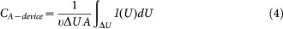 Where υ is the scan rate (V/s), ΔU is the potential window (V), I(U) is the voltammetric discharge current (A) and A is the effective area (cm2), which is calculated based on the entire surface area of two electrodes. The area specific capacitance of one single electrode is calculated based on the effective area of the device according to the following formula: C = 4CA-device, Where the factor 4 is related to normalization to the area of one electrode for the two identical capacitors in series48. The volumetric and areal specific capacitance values of devices are calculated from the galvanostatic curves at different current densities using the following equations: