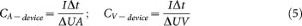 The area specific capacitance value is calculated from the CV data according to the following equation: