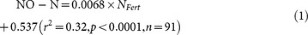Total NO emissions for a given sampling period were found to be significantly related to N application rates within the same periods (Fig. 2). Dependence of NO emissions (kg N ha−1) on fertilizer N inputs (NFert, kg N ha−1) could be quantitatively represented by an Ordinary Least Squares (OLS) linear regression model: