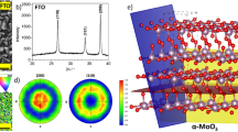 Figure 2a shows the XRD patterns of the MoO3 thin films. The diffraction peaks are readily indexed to orthorhombic phase α-MoO3 (JCPDS card no. 05-0508). No peak representing other crystal phases or impurities was detected. The patterns consist of one strong (110) peak at 23° and several weak peaks corresponding to the (0k0) and other (hk0) planes, which differs from the typical pattern of α-MoO314. Orthorhombic MoO3 is known to exhibit pronounced crystallographic anisotropy leading to growth rate differences in the three principle axes: [001] > [100] ≫ [010]14. As a result, α-MoO3 crystals tend to crystallise with a thin platelet morphology with well-developed (0k0) crystal faces while their long axis lays preferentially along the [001] direction14,15. XRD patterns of these α-MoO3 crystals generally reflect intense (0k0) diffraction peaks14,15. However, the α-MoO3 thin film samples obtained in this work exhibited a significantly enhanced I(110)/I(020) XRD peak intensity ratio compared to the typical pattern of α-MoO3 which suggests the closed packed planes for these films are the (kk0) planes. The diminished (0k0) diffraction peaks further suggest the layered structure is less periodic in the [001] direction, which implies the layered structures of these (kk0)-oriented MoO3 films are constructed from smaller octahedral bi-layer sheets.
