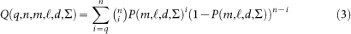 The probability that an ℓ-mer is within distance d from at least q out of n strings of length m each is: