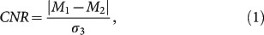 where M1 and M2 are the mean δ value of region (1) and (2), σ3 is the standard deviation of δ value in background region (3) which provides a measure of the image noise level. The uncertainty of the CNR was determined by standard error propagation method21. Table 1 lists the CNR of the ROIs in IPC and GPC. The CNR of GPC in motor cortex micrometastasis was 22.3% lower than that of IPC, while in the smaller hippocampus micrometastasis, the CNR of GPC was 267% higher than that of IPC.