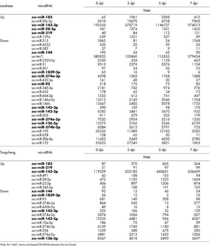 Table 2 Significantly differential expressed microRNAs at all the time points (3,5,7 dpi) compared with control individuals in the two breeds