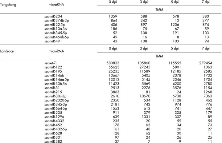 Table 3 Tongcheng/Landrace specific DEmiRNAs compared with control individuals