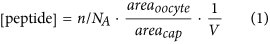 , where Q is the total gating charge (26 nC) obtained with cut-open voltage clamp after 2 days of RNA incubation with Shaker-W434F. Since only part of the oocyte is clamped in cut-open voltage clamp, the ratio of whole oocyte surface to clamped sherical cap surface was calculated using an oocyte radius of 0.5 mm and an angle of 30° from the center of the oocyte to the spherical cap edge. The final concentration of N-termini is then given by equation 1, where V is the oocyte volume (0.52 μl) as calculated from the radius.