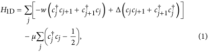 are annihilation and creation fermionic operators at site j. The parameters w, Δ and μ are the tunneling strength, superconducting gap and chemical potential, respectively.