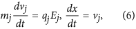 where mj, qj, xj are the mass, charge and position of the jth SP, respectively. Ej is the electric field at the position of the jth SP. As the dust particles follow their trajectories, they continually exchange information with the background grid. Each dust particle contributes its charge to the corners of its instantaneous host cell. Therefore, the simulation region is divided to contain several grid cells during the PIC simulation. At each time step, the velocities, the positions of SPs are weighted to all the grids to calculate the charge density ρg (or electric current density Jg). Once ρg obtained the Maxwell’s equations (electromagnetic model) or Poisson-Boltzmann equation (electrostatic model) will be solved numerically to derive the value of E at each grid. In electrostatic model, Bg = 0. Then the field imposed on each SP can be worked out and each SP will be driven by electric field according to Eq. (6), which will be solved numerically via the leap-frog algorithm. At last, the new positions and velocities are obtained, the procedure come to repeat until the simulation completed. The summary of a computational cycle of the PIC method is shown in Fig 7.