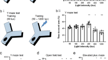 The procedure for contextual fear conditioning (CFC) was modified from those described previously39,40,41,42,43. The training chambers of CFC were purchased from the Med Associates with a Near Infrared Video System, which is supported by a near infrared camera (Med Associates Inc., Vermont, USA). Before CFC, mice were allowed to acclimate to the chambers without footshock for continuous 3 d. The CFC paradigm was consisted of a 5 min measurement for baseline freezing level (BL) and 8 training trials with electrical footshock (3 s, 1.2 mA) and the average of intertrial intervals was about 2 min. The mice were placed back to homecage 2 min after the final trial. The chambers were cleaned by using 25% ethanol before training. Then, short-term memory (STM) 30 min and/or long-term memory (LTM) 6 h after the CFC were measured by placing animals back to the conditioned chambers for 3 min. All experiments were performed under the dark condition (<1 lux) during the night except the light treatment mentioned elsewhere. The freezing behavior was monitored by the Video System and stored in a computer. The freezing level that indicates the performance of learning and memory was automatically measured by the software from Med Associates Inc.