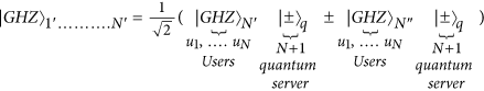 In our scheme, when the quantum server receives a user(s) request for communication with another user, the quantum server distributes GHZ entanglement states among the involved participants’ users in the communication process. Distribution is established after successful completion of the authentication process prior to the commencement of the communication process. The quantum server distributes all generated particles but holds one for itself. As a consequence, the quantum server and the participated users become entangled due to the presence of only one particle per distributed GHZ state. In addition, GHZ measurement is used by the receiver or quantum server, depending on the type of cooperation used during inter-user communication. Consistent with the GHZ measurement result, the receiver determines which unitary operations are used by the senders to transform the GHZ state according to the original generated classical message before it is transmitted to the receiver. By obtaining the applied unitary operations, the receiver can retrieve the original sent message. The Eight GHZ States are defined by (Eq. (10)).