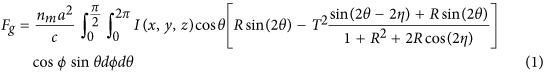 where nm is the refractive index of the surrounding medium (water), I(x, y, z) is the intensity distribution of the Gaussian beam, (θ, ϕ) are the polar and azimuth angles, respectively in spherical coordinates and η is the refraction angle (for details see Supplementary Information).
