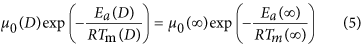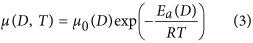Because the effect of the exponential term of exp[−Ea(D)/(RT)] on μ(D,T) is much stronger than the effect of μ0(D), as a first-order approximation, one can assume that μ0(D) ≈ μ0(∞). Therefore, there is