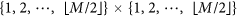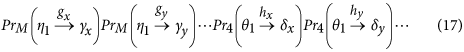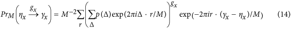 In our model, the location space is characterized by a two-dimensional lattice satisfying the periodic boundary condition (a1 + j1M, a2 + j2M) = (a1, a2) where j1 and j2 are integers. Given that the ancestor of Ix at the time T is located in ηx and until then gx migration events occur upon the lineage of Ix, the migration process along the lineage of Ix becomes a discrete random walk on the two-dimensional lattice. One-step migration paths and the corresponding probabilities describe the displacement distribution that a single step of the random walker leads to. Consequently, the probability that Ix is located in γx is