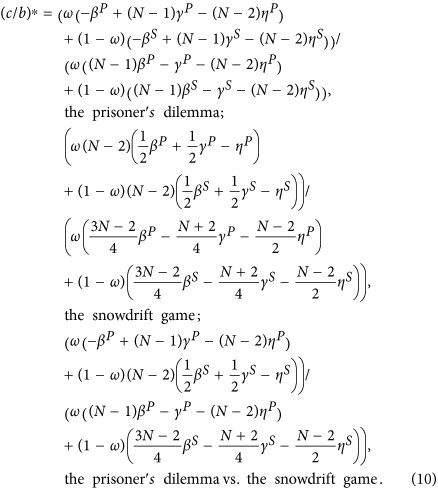 Cooperation is favored by natural selection if the cost-to-benefit ratio c/b is below the critical one (c/b)* which is obtained when 〈xC〉 = 0.5. Larger (c/b)* means that cooperation is more favored. The expression of (c/b)* for ω ∈ [0, 1] is
