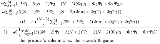 is the frequency of the strategy (d1, d2) where d1, d2 ∈ {0, 1} (1 for cooperation and 0 for defection) are the strategy of the first layer and the one of the second, respectively. The parameter ω ∈ [0, 1] specifies the proportion of the cooperative level of the first layer in the overall cooperative level. For ω = 0.5, xC is measured in the traditional way17,18,19, in which the cooperative behavior of each layer plays an equal role in measuring xC. ω = 1 or ω = 0 means that the cooperative level of only the first or of only the second determines xC.