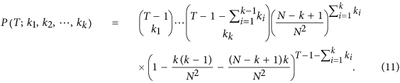 By considering all possible strategies and locations of k − 1 ancestors at the first coalescence in Eq. (16), all possible first coalescence pairs in Eq. (17), all possible values of T and of k1, k2, ···, kk in Eq. (12), all possible values of g1, g2, ···, gk and of h1, h2, ···, hk in Eq. (13) and weighting the system in those states by the stationary probabilities, we obtain a recurrence relation between the strategy-and-location distribution of k individuals and the one of k − 1 individuals, whose initial condition is the known distribution of one individual’s strategy and location.