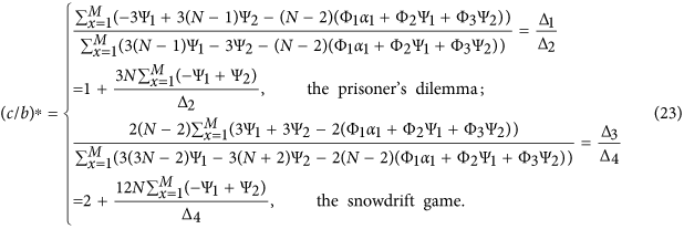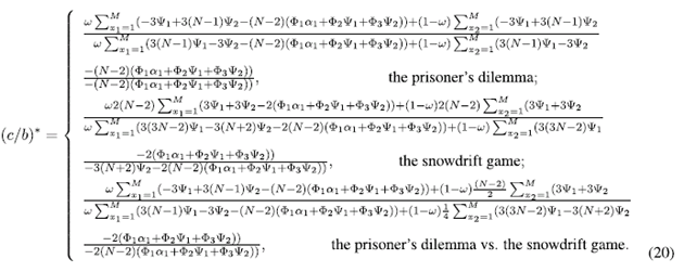 when only the second. Eq. (21) or (22) happens to be the condition for cooperation in the two-layered network model when ω = 1 or when ω = 0 (see Eq. (9)). Without loss of generality, we assume individuals participate in interactions of only the first layer. By letting ω in Eq. (20) be 1, we obtain the (c/b)* of the single-layered network model,