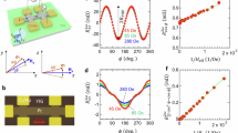 Figure 2(a–c) plot the room-temperature AMR for the Rh/YIG (open symbols) and Pt/YIG (closed symbols) hybrids. As shown in the right panels, the Rh/YIG and Pt/YIG hybrids are patterned into Hall-bar geometry and the electric current is applied along the x-axis. The AMR is measured in a magnetic field of 20 kOe, which is sufficiently strong to rotate the YIG magnetization in any direction. Here the total AMR is defined as