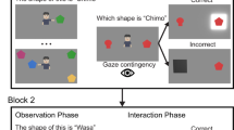 As in neonatal imitation, there are interindividual differences in gaze following30. These individual differences may also be, in part, due to differences in infants’ early social experiences. In social species, including macaques and humans, the early social environment appears critical in the development of social skills31,32,33. While there is evidence of rudimentary gaze following in human newborns34, it continues to mature in the first year of life, during which time it may be influenced by social experience, such as through reinforcement learning35,36. That is, a rich social environment—especially one with joint attention interactions—provides opportunities for infants to learn links between others’ gaze and relevant environmental stimuli37,38. This hypothesis, however, is difficult to test in humans, as we have limited control over infants’ early social environments.