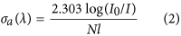 where log(I0/I) is absorptivity from absorption spectrum, N is the Tm3+ doping concentration and l is the sample thickness.