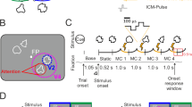 The monkey sat in a monkey chair 68 cm away from the center of a 19-inch computer display for behavioral tasks during the training and recording sessions in a shielded room. The CRT monitor was set so that its center was on the same horizontal plane as the monkey’s eyes. The monkey chair was equipped with a responding button, which was positioned so that the monkey could easily manipulate it. An infrared charge-coupled device (CCD) camera for eye-movement monitoring was firmly attached to the chair by a steel rod. During training and recording sessions, the monkey’s eye position was monitored with 33 ms time resolution by an eye-monitoring system55. The juice reward was accessible to the monkey through a small spout controlled by an electromagnetic valve. A visual stimulus generator (ViSaGe MKII Visual Stimulus Generator, Cambridge Research Systems, UK) controlled the electromagnetic valve, the timing of visual stimuli onset.