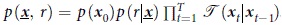 is the distribution over spike trains of length T according to the network dynamics in equation (4). The probability of getting a reward r at the end of the trajectory is given by