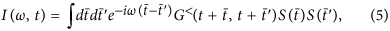 Photoemission spectra I(ω, t) are computed from the Green’s function using a Gaussian probe pulse