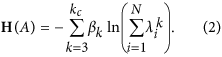 . Note that, a loop is counted several times since each of its nodes can be the starting node and given the starting node, it is counted twice by its two opposite directions. Since the loops counted here are not self-avoiding, it is more complex when a loop contains sub-loops. Roughly speaking, TrAk is 2k times the number of loops of length k, while to determine the exact number is not feasible. The approximated factor 2k can be taken into account by the parameter βk and the cases of k = 1 and k = 2 are trivial since TrA1 is 0 and TrA2 is simply twice the number of total links, so we only consider the terms TrAk for k ≥ 3. As k → ∞, TrAk+1/TrAk → λ1, i.e. TrAk grows exponentially with the leading eigenvalue λ1. Thus we take the logarithm to rescale each term in H(A) to the same magnitude.